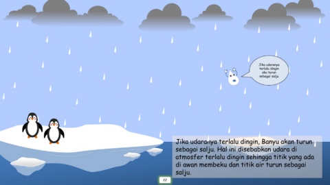 Jika udaranya terlalu dingin aku turun sebagai salju Jika udaranya terlalu dingin, Banyu akan turun sebagai salju. Hal ini disebabkan udara di atmosfer terlalu dingin sehingga titik yang ada di awan membeku dan titik air turun sebagai salju. 22