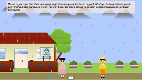 Musim hujan telah tiba. Pada senin pagi langit berawan gelap dan turun hujan di SD Jaya. Gedung sekolah, pohon
