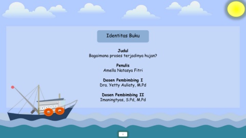 Identitas Buku Judul Bagaimana proses terjadinya hujan? Penulis Amella Natasya Fitri Dosen Pembimbing I Dra. Yetty Auliaty, M.Pd Dosen Pembimbing II Imaningtyas, S.Pd, M.Pd i