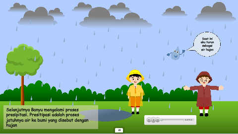 Saat ini aku turun sebagai air hujan Selanjutnya Banyu mengalami proses presipitasi. Presitipasi adalah proses jatuhnya air ke bumi yang disebut dengan hujan 21