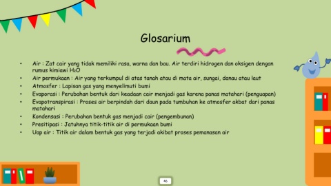 • Air : Zat cair yang tidak memiliki rasa, warna dan bau. Air terdiri hidrogen dan oksigen dengan