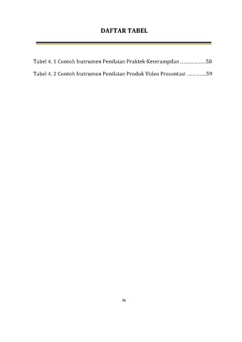 DAFTAR TABEL Tabel 4. 1 Contoh Instrumen Penilaian Praktek Keterampilan…….…………58 Tabel 4. 2 Contoh Instrumen Penilaian Produk Video Presentasi …………..59 ix