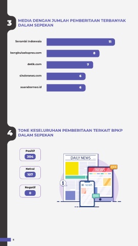 3 MEDIA DENGAN JUMLAH PEMBERITAAN TERBANYAK DALAM SEPEKAN Serambi Indonesia 11 bengkuluekspres.com 8 detik.com 7 sindonews.com 6 suaraborneo.id 6 4 TONE KESELURUHAN PEMBERITAAN TERKAIT BPKP DALAM SEPEKAN Positif 304 Netral 107 Negatif 0 5