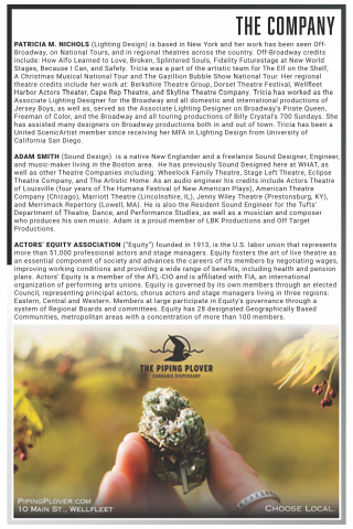 H (Sound Design) is a native New Englander and a freelance Sound Designer, Engineer, and music-maker living in the Boston area. He has previously Sound Designed here at WHAT, as well as other Theatre Companies including: Wheelock Family Theatre, Stage Left Theatre, Eclipse Theatre Company, and The Artistic Home. As an audio engineer his credits include Actors Theatre of Louisville (four years of The Humana Festival of New American Plays), American Theatre Company (Chicago), Marriott Theatre (Lincolnshire, IL), Jenny Wiley Theatre (Prestonsburg, KY), and Merrimack Repertory (Lowell, MA). He is also the Resident Sound Engineer for the Tufts'