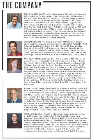 ROBIN BLOODWORTH (Bailiff) is glad to be returning to WHAT and to collaborate with both Kevin Rice and Tim Habeger again. Other credits include: Artist Descending A Staircase, A Dollʼs House,The Kritik, Everything is Established, Glengarry Glen Ross, TheWeir, The Deer and the Antelope, Buried Child, Tiny Beautiful Things, Leninʼs Embalmers, The Pickleball Wars, The Young Man from Atlanta, Hopperʼs Ghosts, Nickʼs Flamingo Grill, (AllianceTheater), Girl Science (Ensemble Studio Theater).