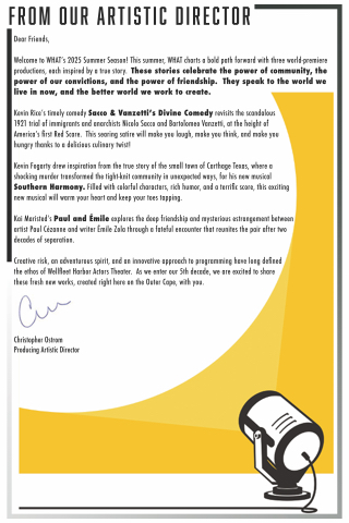 Creative risk, an adventurous spirit, and an innovative approach to programming have long defined the ethos of Wellfleet Harbor Actors Theater. As we enter our 5th decade, we are excited to share these fresh new works, created right here on the Outer Cape, with you.