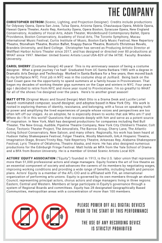 CHRISTOPHER OSTROM (Scenic, Lighting, and Projection Designer) Credits include productions for Odyssey Opera, Opera San Jose, Tulsa Opera, Arizona Opera, Chautauqua Opera, Mobile Opera, Hawaii Opera Theater, Asolo Rep, Kentucky Opera, Opera Boston, Syracuse Opera, New England Conservatory, Academy of Vocal Arts, Adam Theater, Wonderbound Contemporary Ballet, Opera Providence, Boston Conservatory, Academy of Vocal Arts, The Toronto Symphony, Macau International Music Festival, Curtis Institute of Music, Boston Early Music Festival, New Repertory