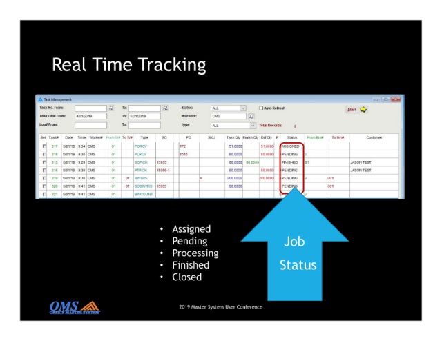 Job Status 2019 Master System User Conference racking Assigned • Pending • Processing • Finished • Closed • Real Time T