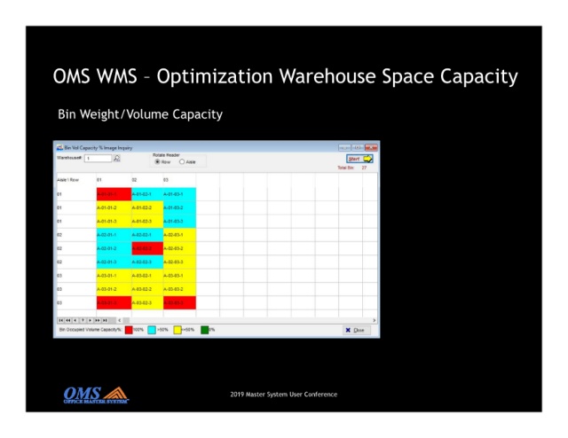 Optimization Warehouse Space Capacity 2019 Master System User Conference OMS WMS – Bin Weight/Volume Capacity