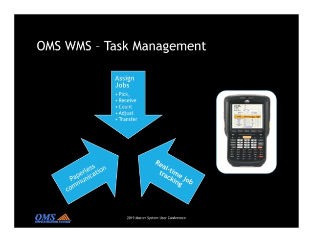 ask Management 2019 Master System User Conference Assign Jobs •Pick, Receive Count Adjust •Transfer T • • • OMS WMS –