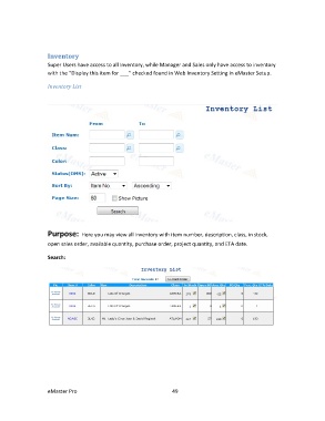 Purpose: Here you may view all inventory with item number, description, class, in stock,