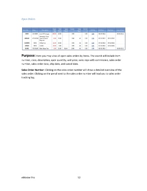 number, class, description, open quantity, unit price, sales reps with commission, sales order