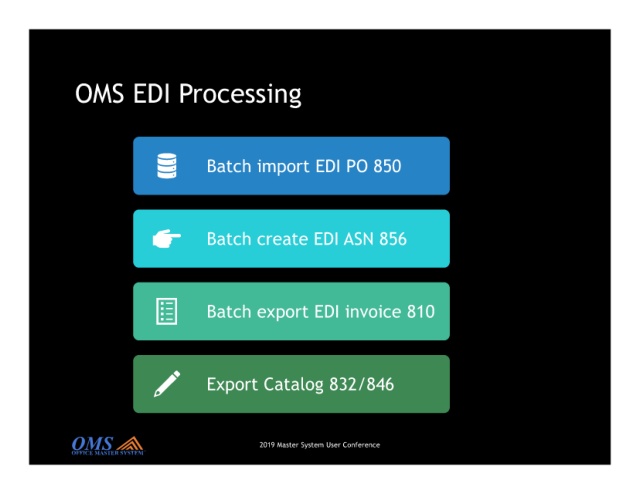 OMS EDI Processing Batch import EDI PO 850 Batch create EDI ASN 856 Batch export EDI invoice 810 Export Catalog 832/846 2019 Master System User Conference