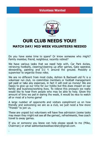 MATCH DAY/ MID WEEK VOLUNTEERS NEEDED
