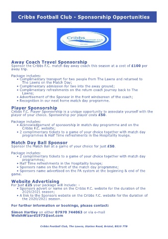 • A link to the Sponsors website on the Cribbs F.C. website for the duration of
