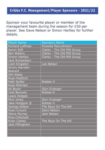 Cribbs F.C. Management/Player Sponsors - 2021/22