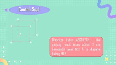 Contoh Soal H G E F D C Diberikan kubus ABCD.EFGH . Jika A B panjang rusuk kubus adalah 2 cm, berapakah jarak titik A ke diagonal bidang EB ?