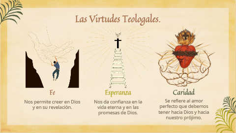 Las Virtudes Teologales. Fe Esperanza Caridad Nos permite creer en Dios Nos da confianza en la Se refiere al amor y en su revelación. vida eterna y en las perfecto que debemos promesas de Dios. tener hacia Dios y hacia nuestro prójimo.