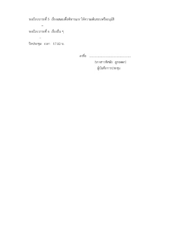 ่ ่ ่ ี ระเบียบวาระท 5 เรืองเสนอเพือพิจารณา/ ใหความเห็นชอบหรืออนุมัต ิ – ี ่ ระเบียบวาระท 6 เรืองอื่น ๆ ่ – ุ ปดประชม เวลา 17.00 น. ่ ื ลงชอ ....................................................... (นางสาวพิศมัย ภูยอดผา) ผบันทึกการประชุม ู