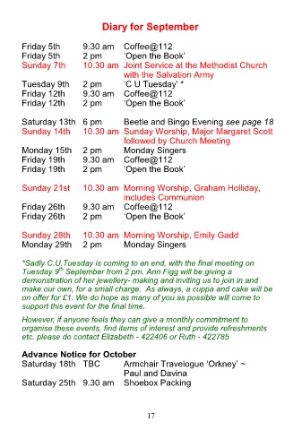 Saturday 13th 6 pm Beetle and Bingo Evening see page 18
