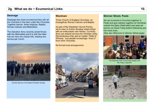 Evangelical, Roman Catholic and Baptist. we’re keen to further develop relationships with an enthusiastic new Rector. Currently there are shared services for Christian Unity, Remembrance Day and an Easter “Walk of Witness,” and people increasingly “drop in”