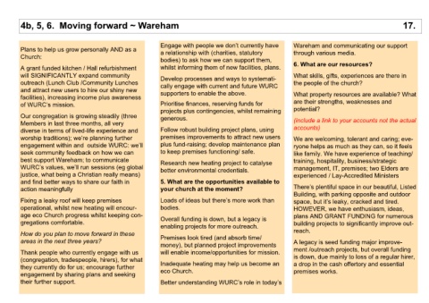 through various media.   Wareham and communicating our support   6. What are our resources?   What skills, gifts, experiences are there in  the people of the church?    What property resources are available? What  are their strengths, weaknesses and            potential?   (include a link to your accounts not the actual   accounts)    We are welcoming, tolerant and caring; eve- ryone helps as much as they can, so it feels  like family. We have exper