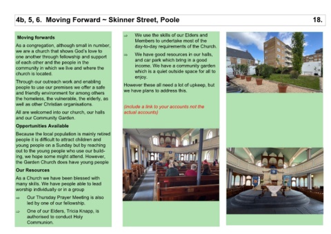 Moving forwards  As a congregation, although small in number,  we are a church that shows God’s love to  one another through fellowship and support  of each other and the people in the          community in which we live and where the   church is located.  Through our outreach work and enabling  people to use our premises we offer a safe  and friendly environment for among others  the homeless, the vulnerable, the elderly, as  well as other Christian