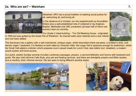 women) lead our worship. Baptist, Methodist and URC preachers (at least half of whom are Our Grade II listed building – The Old Meeting House - originated in 1694 but was gutted by the Great Fire of Wareham. Its charred walls were retained and a new interior The Sanctuary has a gallery with a well-maintained, antique organ, whilst downstairs there are pews, a children’s area, and electric organ / keyboard. It is flanked on both