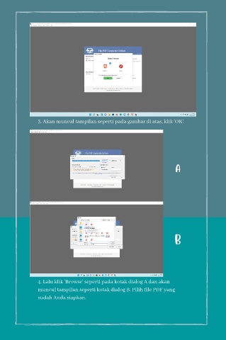 3. Akan muncul tampilan seperti pada gambar di atas, klik 'OK'. A B 4. Lalu klik 'Browse' seperti pada kotak dialog A dan akan muncul tampilan seperti kotak dialog B. Pilih file PDF yang sudah Anda siapkan.