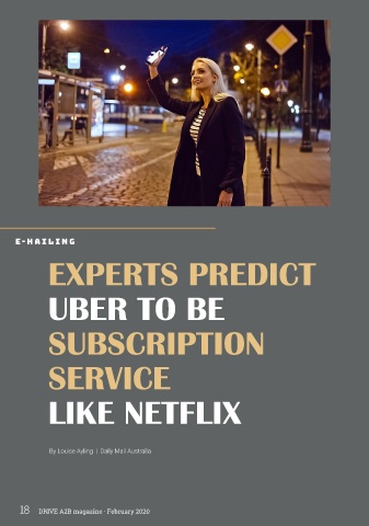 E -HAILING EXPERTS PREDICT UBER TO BE SUBSCRIPTION SERVICE LIKE NETFLIX By Louise Ayling | Daily Mail Australia 18 DRIVE A2B magazine · February 2020
