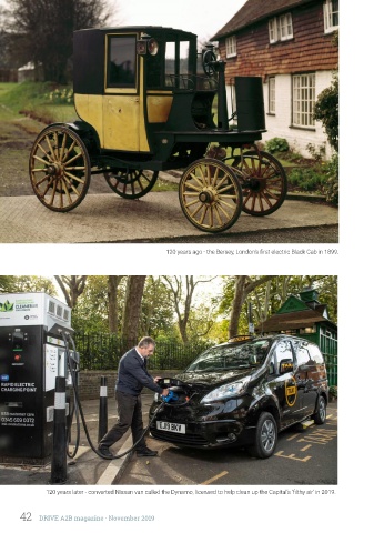 120 years ago - the Bersey, London's first electric Black Cab in 1899. 120 years later - converted Nissan van called the Dynamo, licensed to help clean up the Capital’s ‘filthy air’ in 2019. 42 DRIVE A2B magazine · November 2019