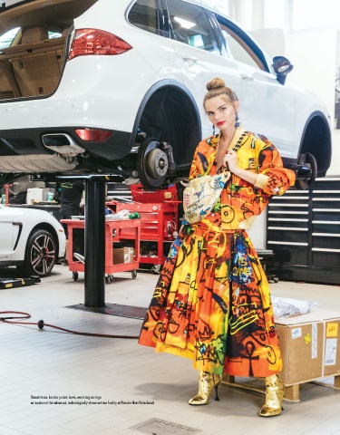 Chanel dress, bomber jacket, boots, waist bag earrings on location at the advanced, technologically-driven service facility at Porsche West Palm Beach clubbraman.com 27