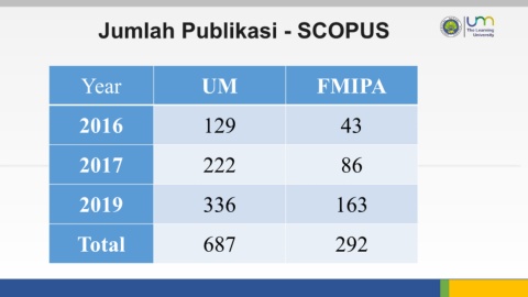 Jumlah Publikasi - SCOPUS Year UM FMIPA 2016 129 43 2017 222 86 2019 336 163 Total 687 292