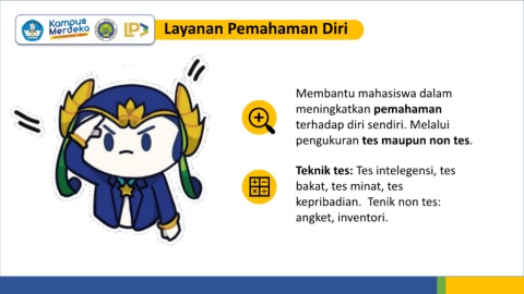 Layanan Pemahaman Diri Membantu mahasiswa dalam meningkatkan pemahaman terhadap diri sendiri. Melalui pengukuran tes maupun non tes. Teknik tes: Tes intelegensi, tes bakat, tes minat, tes kepribadian. Tenik non tes: angket, inventori.