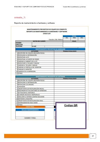 ENSAMBLE Y SOPORTE DE COMPONENTES ELECTRÓNICOS Cuadernillo de actividades y prácticas ormato_1: Reporte de mantenimiento a hardware y software Codigo QR 37