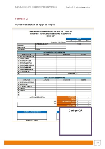 ENSAMBLE Y SOPORTE DE COMPONENTES ELECTRÓNICOS Cuadernillo de actividades y prácticas Formato_2: Reporte de atualización de equipo de cómputo Codigo QR 38