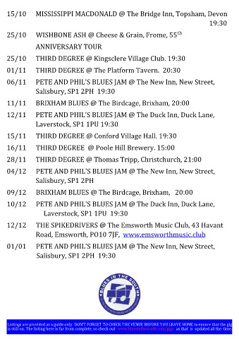 Listings are provided as a guide only. DON’T FORGET TO CHECK THE VENUE BEFORE YOU LEAVE HOME to ensure that the gig