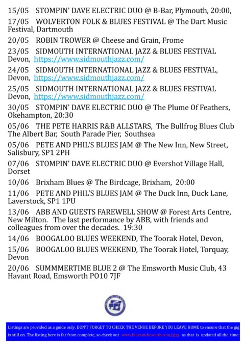 Listings are provided as a guide only. DON’T FORGET TO CHECK THE VENUE BEFORE YOU LEAVE HOME to ensure that the gig