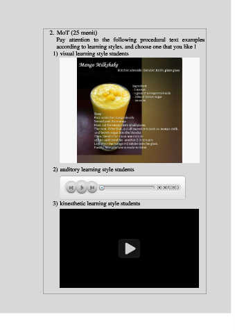 2. MoT (25 menit) Pay attention to the following procedural text examples according to learning styles. and choose one that you like ! 1) visual learning style students 2) auditory learning style students 3) kinesthetic learning style students
