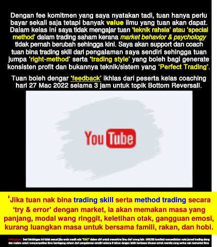 dan malam untuk menyampaikan ilmu berdagang saham dari pengalaman sendiri selama 8 tahun dengan lebih berkesan khusus untuk mereka yang serius nak menuntut ilmu.