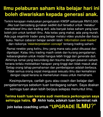dan malam untuk menyampaikan ilmu berdagang saham dari pengalaman sendiri selama 8 tahun dengan lebih berkesan khusus untuk mereka yang serius nak menuntut ilmu.