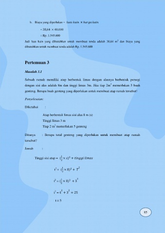 Jadi luas kain yang dibutuhkan untuk membuat tenda adalah 38,64 m dan biaya yang