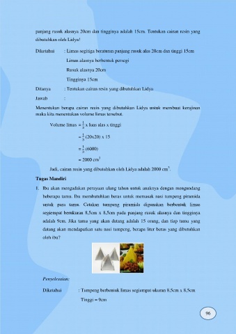 panjang rusuk alasnya 20cm dan tingginya adalah 15cm. Tentukan cairan resin yang