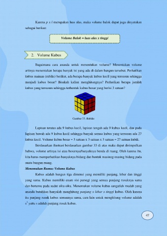 Karena p x l merupakan luas alas, maka volume balok dapat juga dinyatakan