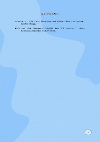 REFERENSI Adinawan, M. Cholik. (2013). Matematika untuk SMP/MTs kelas VIII Semester I. Jakarta : Erlangga. Kemdikbud. 2014. Matematika SMP/MTS Kelas VIII Semester 2. Jakarta: Kementerian Pendidikan dan Kebudayaan. 75