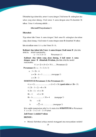 Kalimat: tiga tahun lalu Umur A sama dengan 2 kali umur B jika kita
