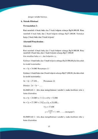 Kalimat: 4 buah buku dan 5 buah bolpoin seharga Rp24.000,00 jika kita ubah