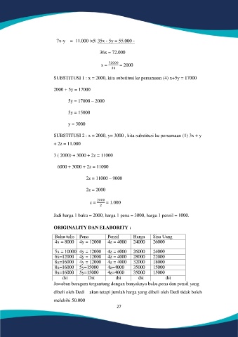 Jadi harga 1 buku = 2000, harga 1 pena = 3000, harga 1 pensil = 1000.
