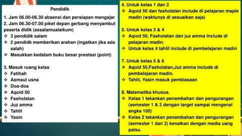 1. Jam 06.00-06.30 absensi dan persiapan mengajar madin (waktunya di sesuaikan saja)