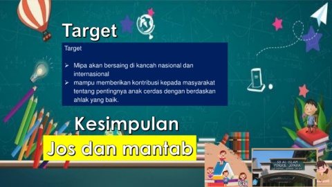 Target Mipa akan bersaing di kancah nasional dan internasional mampu memberikan kontribusi kepada masyarakat tentang pentingnya anak cerdas dengan berdaskan ahlak yang baik.